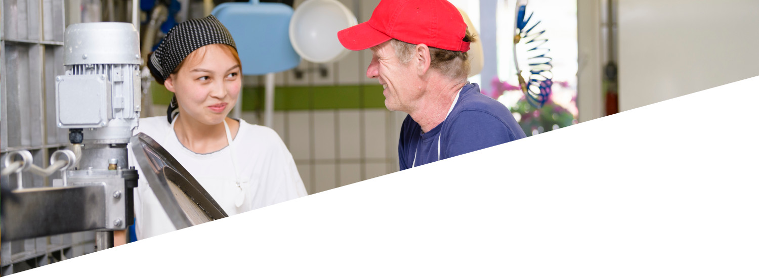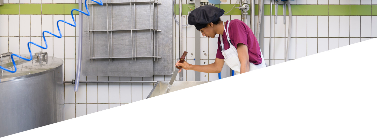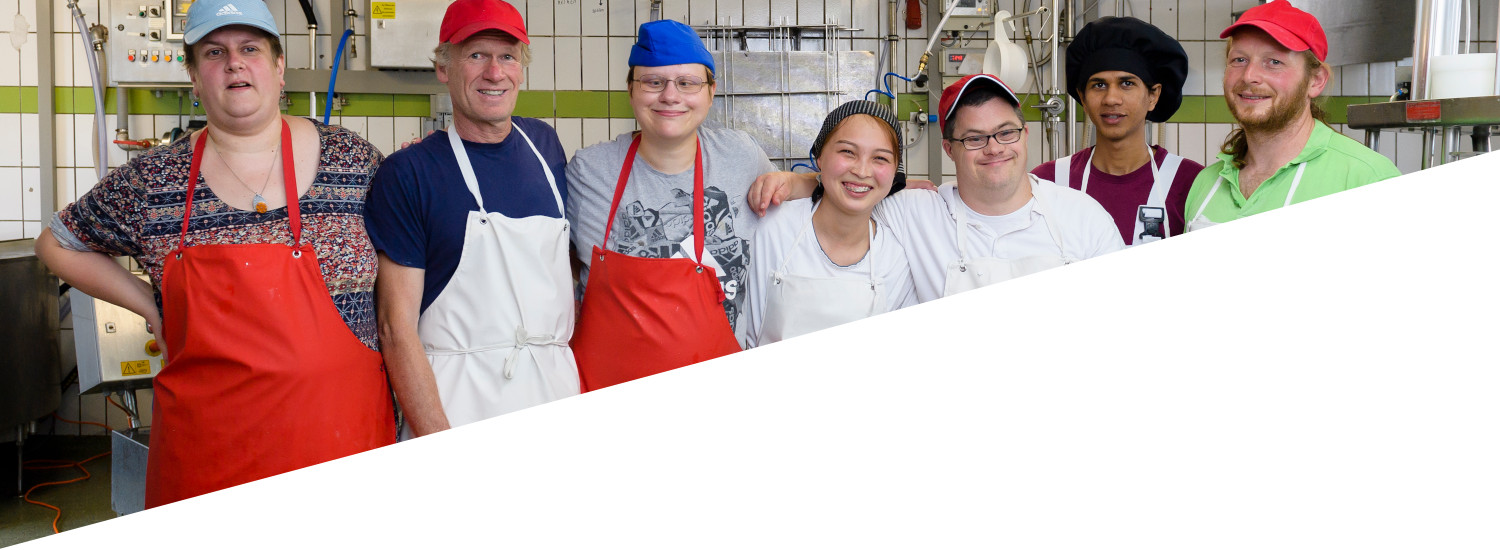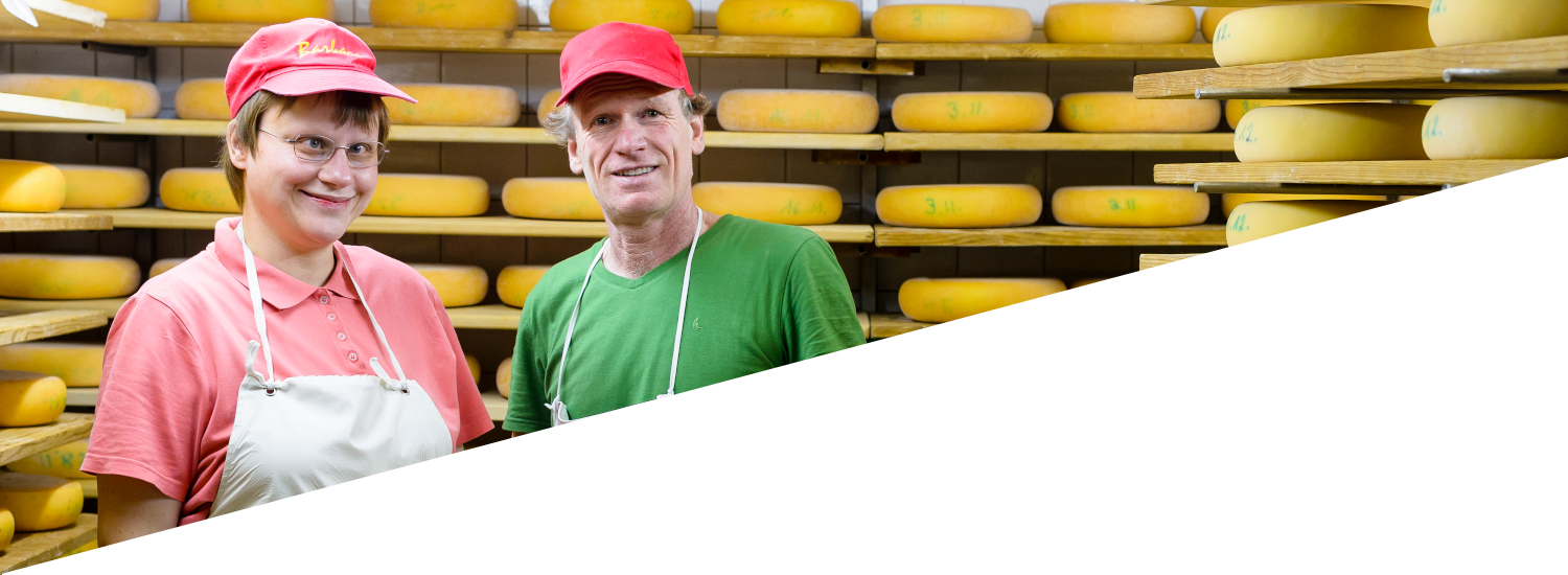 Unsere Arbeit ist sehr vielfältig. Wir erhitzen die Milch, rühren, laben, schneiden, brechen und pflegen sie in ihren unterschiedlichsten Entwicklungsstufen bis hin zum fertigen Käselaib. Zwischendrin kommen bei manchem Kräuter, Gewürze oder Möhrensaft hinzu. Die Molke, die beim Käsen entsteht, findet ihren Weg zu den Schweinen als wertvolle Proteinquelle. Während der Reifezeit des Käses will jede Sorte ganz individuell gepflegt werden: gesalzen, gewendet, ein Weilchen in Ruhe gelassen und zum Ende hin vielleicht geräuchert werden. Für die Herstellung von Joghurt wird die Milch gesäuert und kann dann ziemlich direkt abgefüllt werden. Unser Quark hingegen wird traditionell ohne Zugabe von Lab bereitet und von Hand geschöpft. Dadurch bekommt er seinen ganz besonderen Geschmack. Und bei der Herstellung der Crèmes wird wiederum einer ganz eigenen Rezeptur gefolgt.
